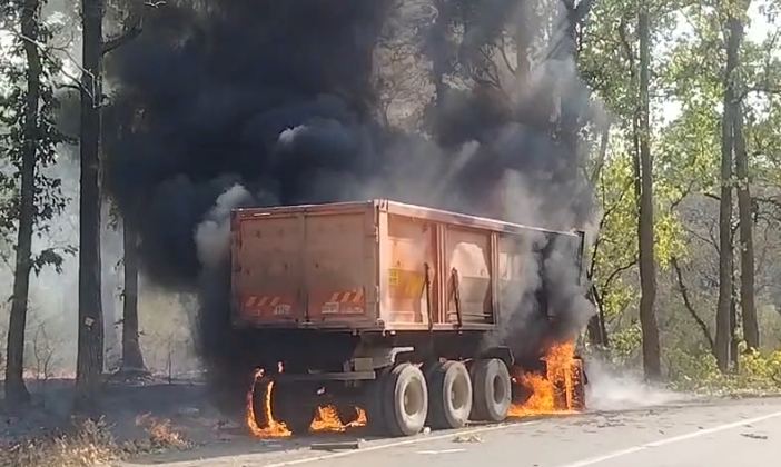 बलरामपुर जिला मुख्यालय एनएच-343 राष्ट्रीय राजमार्ग पर डूमरखी बैरियर के समीप आज लगभग तीन बजे एक बड़ा हादसा हो गया जहां एक तेज रफ्तार खाली ट्रेलर वाहन अनियंत्रित होकर सड़क किनारे सरई के पेड़ से जा टकराया। टक्कर इतनी भीषण थी कि कुछ ही पलों में पूरा ट्रेलर आग की लपटों में घिर गया।