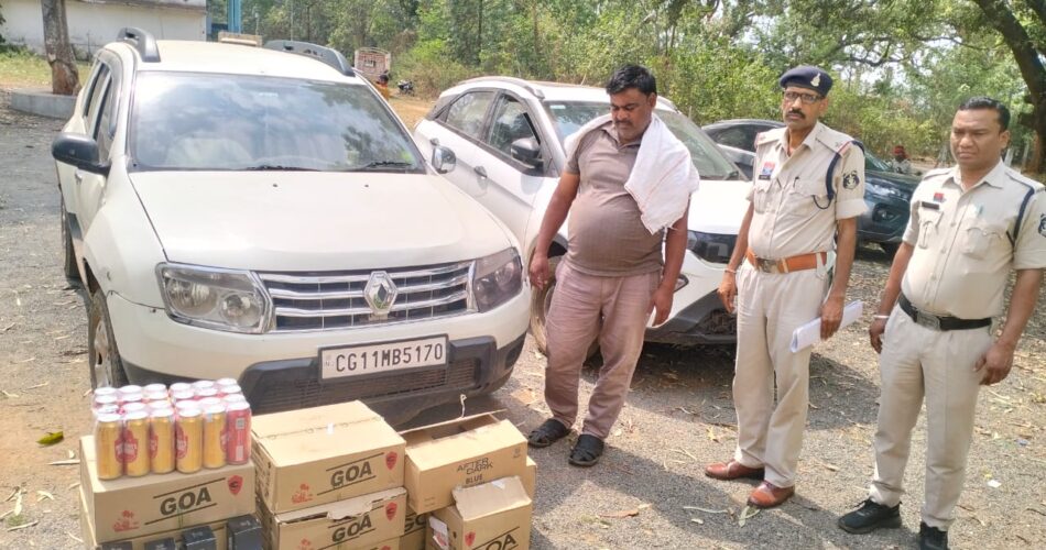 जानकारी के मुताबिक, पुलिस को 29 अप्रैल को मुखबिर से सूचना मिली कि बहेराडीह निवासी दया साहू नामक व्यक्ति मध्य प्रदेश से भारी मात्रा में शराब लाकर अपने पुराने खंडहर मकान में रखा है और अपने कार में रखकर आसपास के क्षेत्र में बिक्री कर रहा है। सूचना पर पुलिस टीम मौके पर जाकर दबिश दी, जहां दया साहू अपनी डस्टर कार क्रमांक सीजी 11 एमबी 5170 में रोड की तरफ निकल रहा था। पूछताछ करने पर वह अपना नाम दया साहू पिता स्व. अमीन साहब 52 वर्ष, निवासी लुण्ड्रा बताया। चालक की गतिविधि संदिग्ध पाए जाने पर वाहन की तलाशी ली गई तो डिक्की में रखा आफ्टर डार्क व्हिस्की का 06 नग बोतल (750 एमएल) कार्टून डब्बे में गोवा लिखो अंग्रेजी शराब जिसमें नग 180 एमएल कुल 300 नग, कुल मात्रा 101.46 लीटर शराब मिला। जब्त किए गए शराब की कीमत 92060 रुपये एवं घटना में प्रयुक्त डस्टर कार क्रमांक पुलिस टीम द्वारा बरामद की गई है। अवैध रूप से शराब बिक्री करने के मामले में थाना लुण्ड्रा में धारा 34(2) आबकारी एक्ट का अपराध पंजीबद्ध किया गया है। पुलिस ने आरोपी को न्यायिक रिमांड पर भेज दिया है। कार्रवाई में सहायक उप निरीक्षक अजीत कुमार मिश्रा, शिवचरण साहू, प्रधान आरक्षक महेश कुमार, जयदीप सिंह, विकास सिन्हा, भोजराज पासवान, आरक्षक मनीष सिंह, अमन पुरी, इब्नुल खान, बालेश्वर सिंह, राजकुमार यादव सक्रिय रहे।