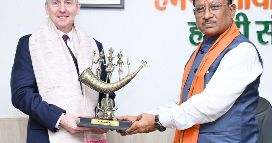रायपुर। मुख्यमंत्री विष्णु देव साय से आज राजधानी रायपुर स्थित मुख्यमंत्री निवास में ऑस्ट्रेलिया के महावाणिज्य दूत बर्नार्ड लिंच ने सौजन्य मुलाकात की। मुख्यमंत्री विष्णु देव साय ने राज्य में चल रही विकास योजनाओं, विशेष रूप से आदिवासी और ग्रामीण क्षेत्रों में स्वास्थ्य, पेयजल एवं पोषण सुधार के प्रयासों की जानकारी साझा की। उन्होंने बताया कि छत्तीसगढ़ सरकार इन क्षेत्रों में तेजी से काम कर रही है और अंतरराष्ट्रीय सहयोग से इन योजनाओं को और प्रभावी बनाया जा सकता है। इस अवसर पर मुख्यमंत्री साय ने बर्नार्ड लिंच को बेल मेटल निर्मित धातु की प्रतिमा भेंट की। इस अवसर पर मुख्यमंत्री के सचिव पी. दयानंद, मुख्यमंत्री के सचिव राहुल भगत, मुख्यमत्री के विशेष सचिव रजत बंसल, सीनियर इकोनॉमिक रिसर्च अफसर सुश्री अनघा सहित अन्य अधिकारी उपस्थित थे।