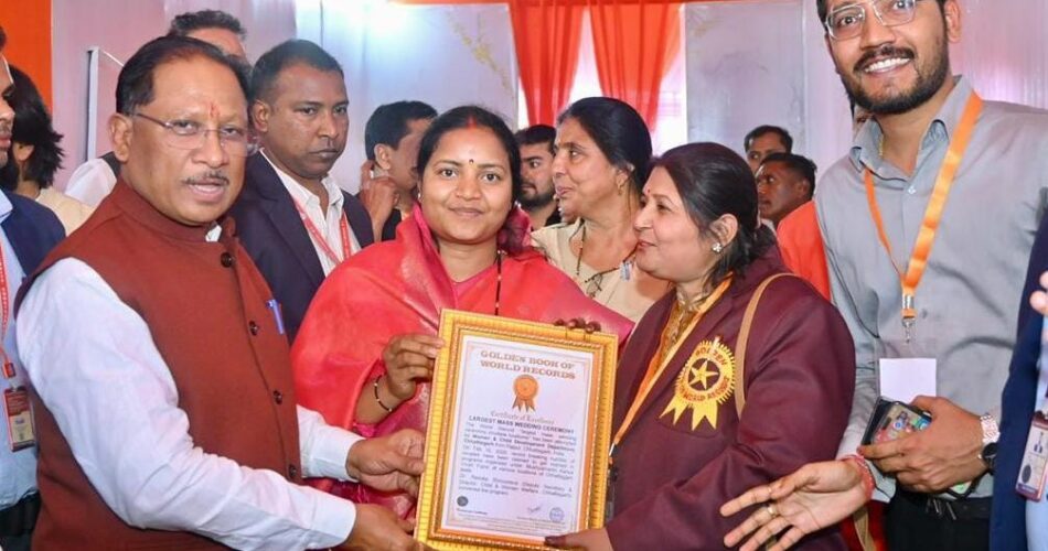 रायपुर। छत्तीसगढ़ ने सामाजिक समरसता, जनभागीदारी और संवेदनशील शासन की दिशा में एक ऐतिहासिक उपलब्धि हासिल करते हुए विश्व स्तर पर अपनी विशिष्ट पहचान दर्ज कराई है। मुख्यमंत्री कन्या विवाह योजना के अंतर्गत आयोजित राज्य स्तरीय सामूहिक विवाह समारोह को गोल्डन बुक ऑफ वर्ल्ड रिकॉर्ड में स्थान मिला है। एक ही दिन में हजारों जोड़ों का विवाह संपन्न कराकर छत्तीसगढ़ ने सामाजिक एकता और अंत्योदय की भावना का ऐसा प्रेरक उदाहरण प्रस्तुत किया है, जिसकी देशभर में सराहना हो रही है।