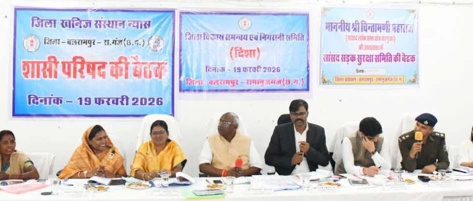 बलरामपुर। जनपद पंचायत राजपुर के सभाकक्ष में जिला खनिज संस्थान न्यास की शासी परिषद, सांसद सड़क सुरक्षा समिति एवं जिला पशु रोगी कल्याण समिति की बैठक आयोजित हुई। बैठक में प्रदेश के आदिम जाति विकास, कृषि एवं किसान कल्याण मंत्री रामविचार नेताम वर्चुअल रूप से जुड़े। इस दौरान सरगुजा सांसद चिंतामणि महाराज, सामरी विधायक श्रीमती उद्देश्वरी पैंकरा, प्रतापपुर विधायक श्रीमती शकुंतला पोर्ते, जिला पंचायत अध्यक्ष श्रीमती हीरामुनी निकुंज, कलेक्टर राजेंद्र कटारा, पुलिस अधीक्षक वैभव बैंकर, वनमंडलाधिकारी आलोक वाजपेयी, जिला पंचायत सीईओ श्रीमती नयनतारा सिंह तोमर, अपर कलेक्टर आर.एन. पाण्डेय, जनपद एवं नगरीय निकायों के अध्यक्ष व उपाध्यक्ष सहित अन्य जनप्रतिनिधि एवं विभागीय अधिकारी उपस्थित थे।
