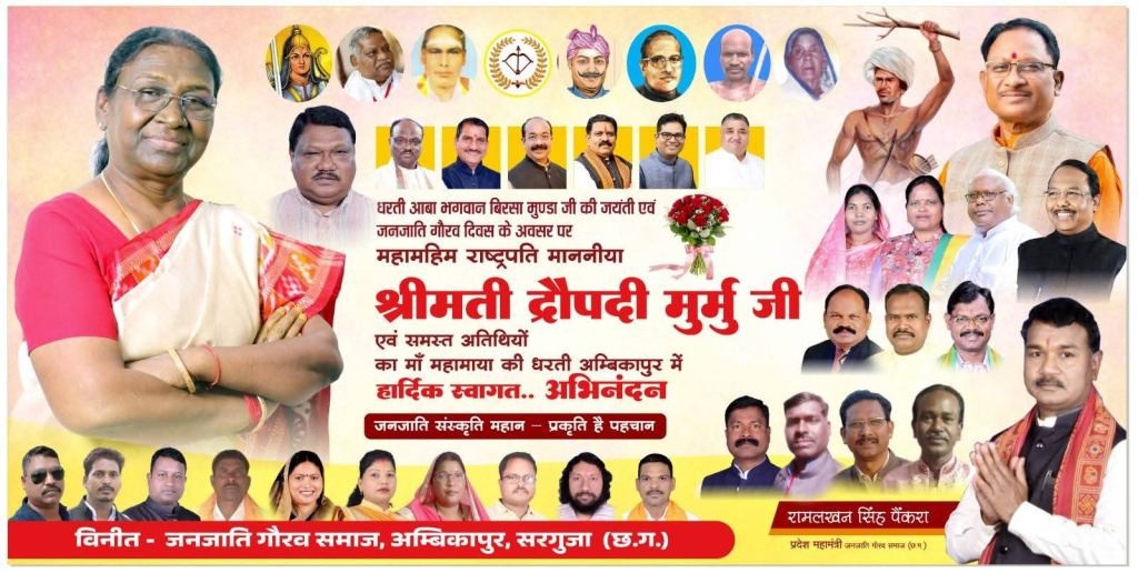 अंबिकापुर। देश की राष्ट्रपति श्रीमती द्रौपदी मुर्मु जनजातीय गौरव दिवस 2025 के उपलक्ष्य में जिले में आज 20 नवम्बर को आयोजित कार्यक्रम में मुख्य अतिथि के रूप में शामिल होंगी। कार्यक्रम का आयोजन पीजी कॉलेज ग्राउंड में किया जाएगा। कार्यक्रम की अध्यक्षता छत्तीसगढ़ के राज्यपाल रमेन डेका करेंगे। कार्यक्रम में विशिष्ट अतिथि छत्तीसगढ़ के मुख्यमंत्री विष्णुदेव साय, मंत्री जनजातीय कार्य मंत्रालय भारत सरकार जुएल ओराम, राज्यमंत्री जनजातीय कार्य मंत्रालय भारत सरकार दुर्गा दास उइके, राज्यमंत्री आवास एवं शहरी मंत्रालय भारत सरकार तोखन साहू होंगे।