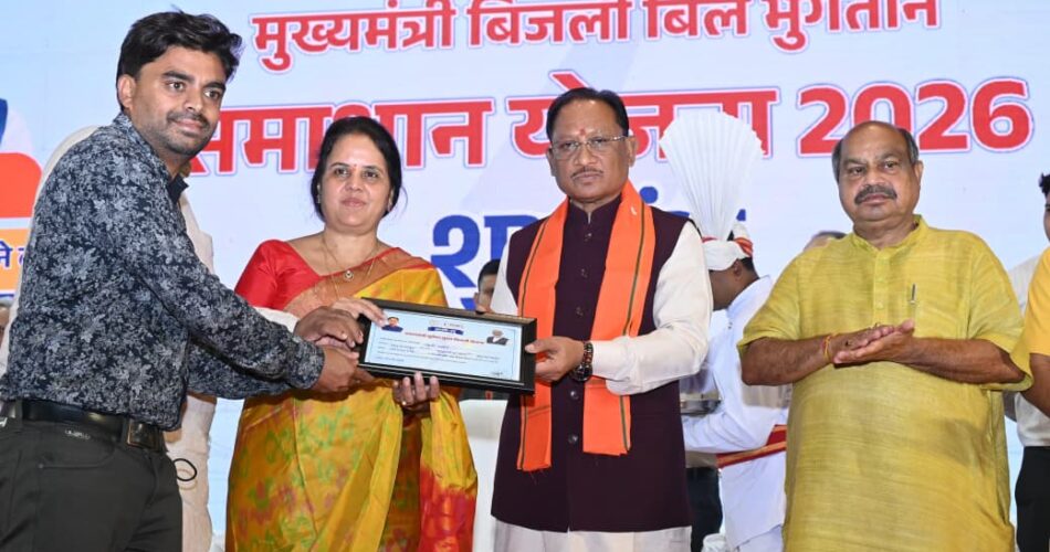 रायपुर। मुख्यमंत्री विष्णु देव साय ने आज राजधानी रायपुर के पंडित जवाहरलाल नेहरू स्मृति चिकित्सालय स्थित सभागार से मुख्यमंत्री बिजली बिल भुगतान समाधान योजना 2026 का शुभारंभ किया। इस अवसर पर उन्होंने योजना का लाभ लेने वाले उपभोक्ताओं को प्रमाण पत्र प्रदान किया और अधिक से अधिक लोगों से योजना का लाभ लेने की अपील की। साथ ही मुख्यमंत्री विष्णु देव साय ने प्रधानमंत्री सूर्यघर मुफ्त बिजली योजना के अंतर्गत 2 हजार 931 हितग्राहियों को 8 करोड़ 79 लाख रुपए की सब्सिडी भी अंतरित की।